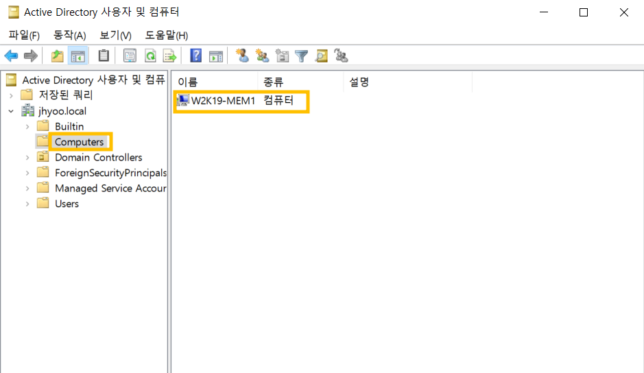 AD 서버로 가서 도구 - Active Directory 사용자 및 컴퓨터 - Computers에 mem1이 생성된 걸 확인할 수 있습니다.
