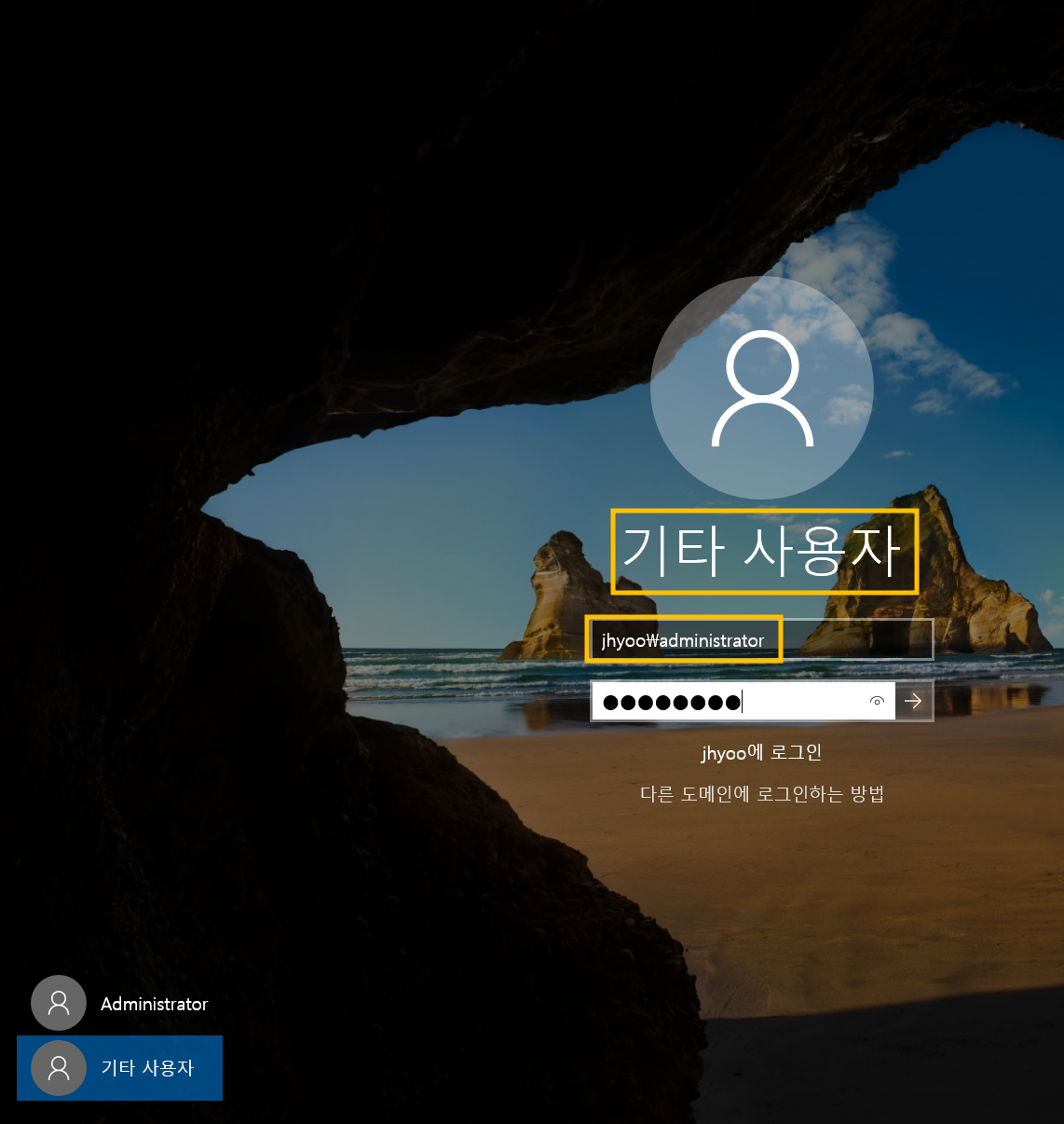 재부팅 후 로그인 화면에서 도메인 로그인을 해줍니다.