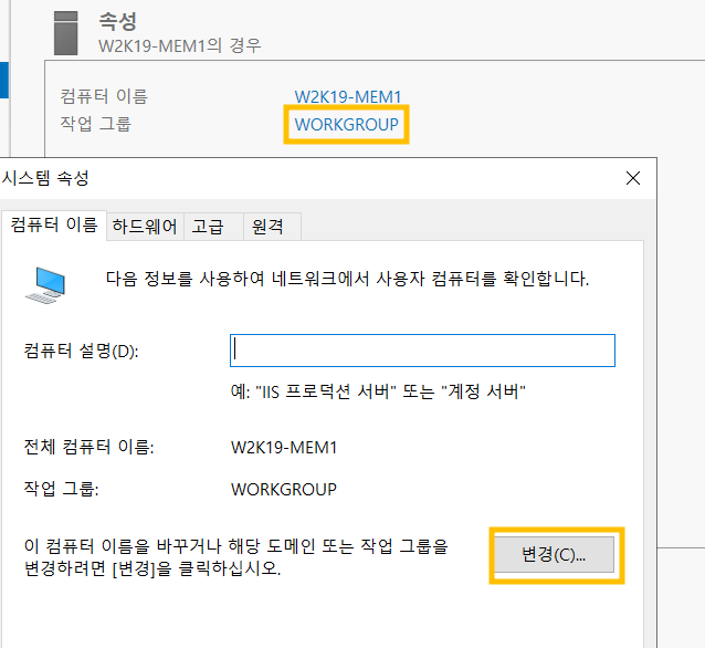 멤버서버로 등록할 MEM1 서버로 가서 시스템속성 - 컴퓨터 이름 - 변경 을 클릭합니다.