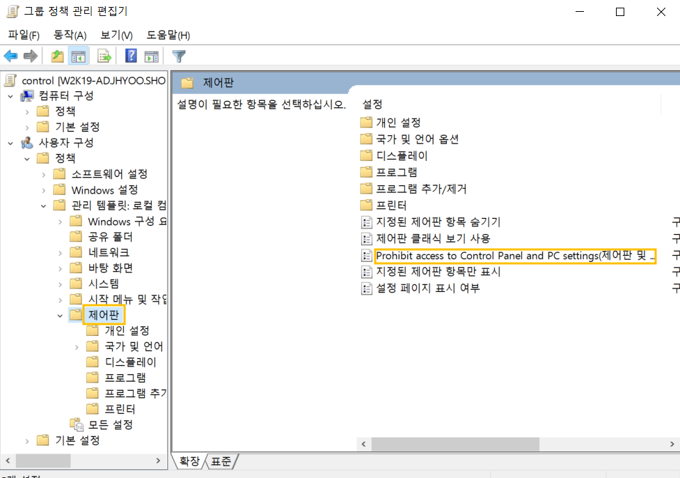적용 설정을 예로 바꾸면 저 정책은 위에 정책에 영향을 받지 않으므로 제어판 접근이 가능하게 설정한 control1_admin의 설정이 반영되어 제어판 접근이 가능하게됩니다.