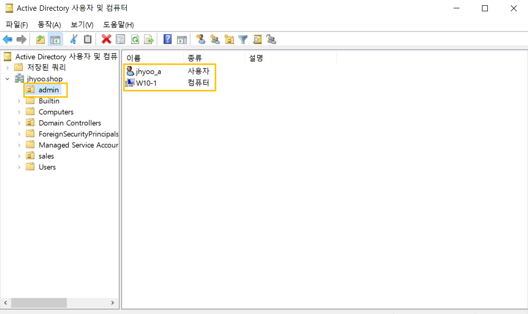 admin에는 w10-1, jhyoo_a 사용자를 넣어주고, sales에는 jhyoo_b를 추가해줬습니다.