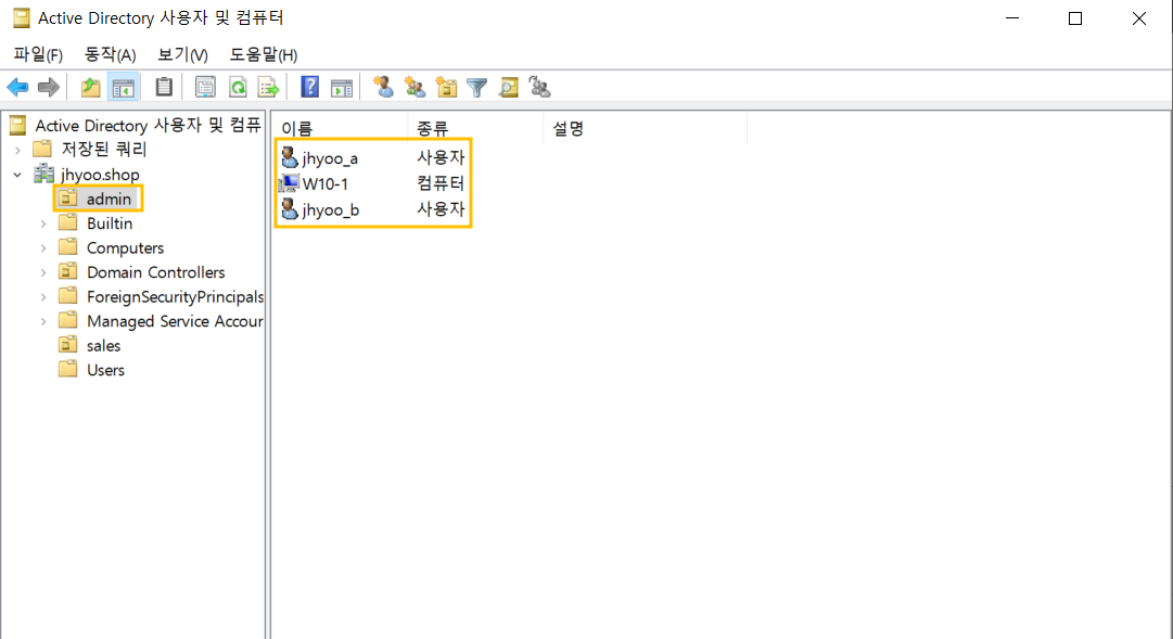 AD 서버로가서 설정을 위해 잠시 b사용자를 admin으로 옮겨줍니다.