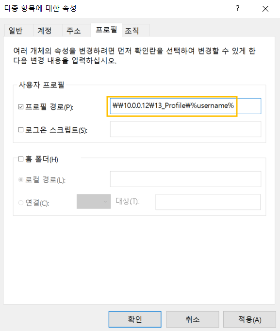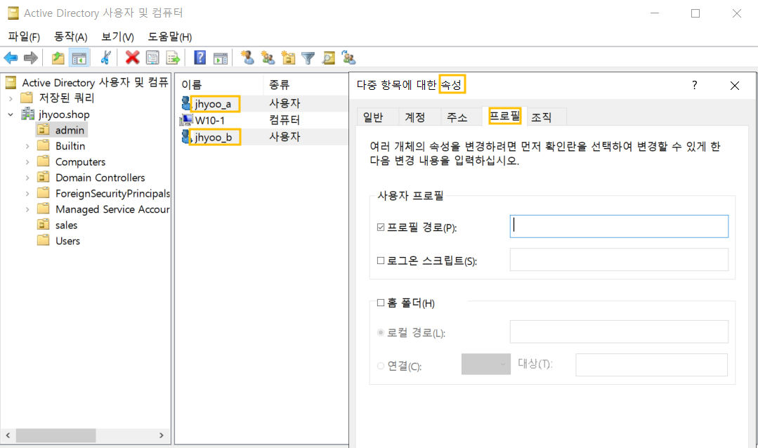 a와 b를 같이 선택 후 오른쪽 버튼 - 속성 - 프로필에서 경로를 아까 만든 폴더로 지정해줍니다.