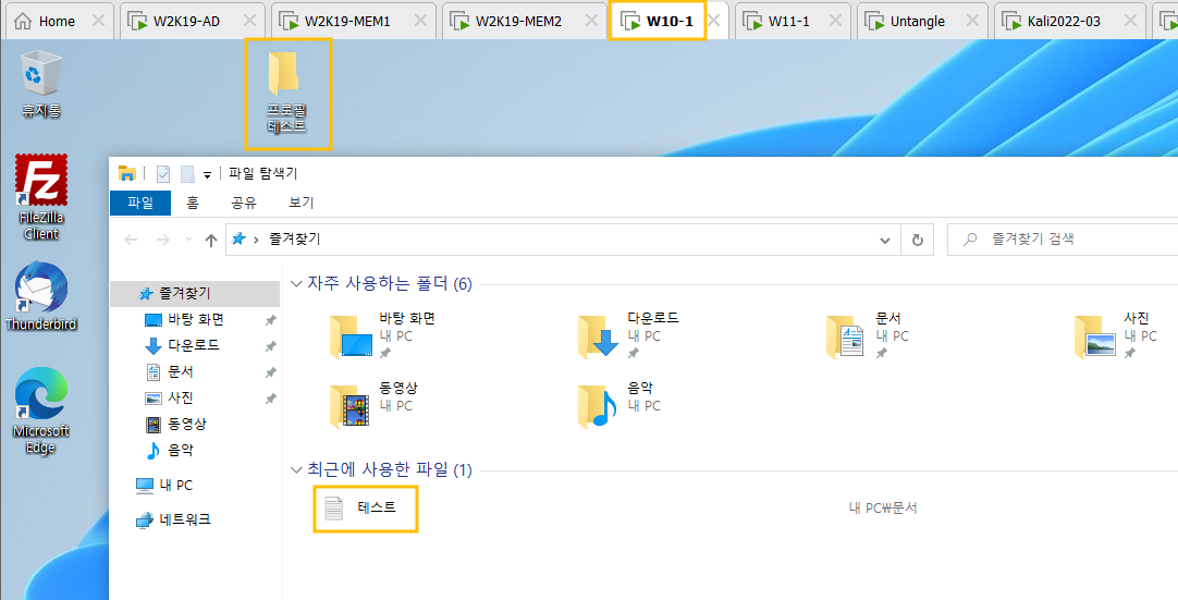 w10 서버에서 b 사용자로 로그인하면 아까 11에서 생성한 것들이 그대로 보여집니다.