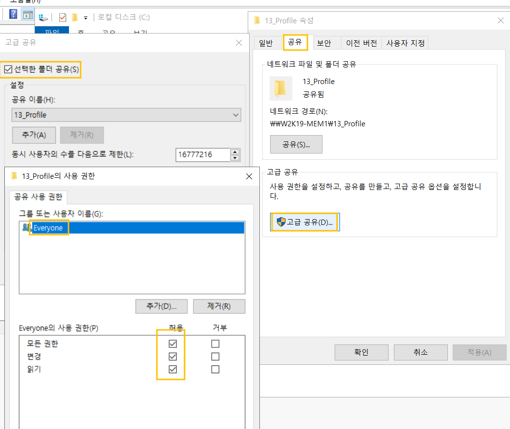 폴더의 공유 권한과 보안 설정을 해줍니다.