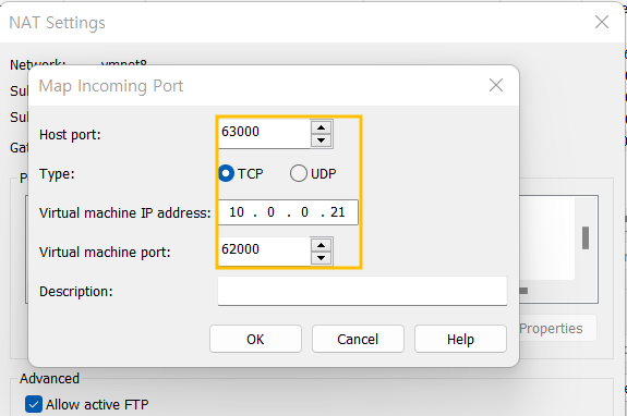 가상머신의 포트는 62000 사용 , 실제 PC의 포트는 63000 사용