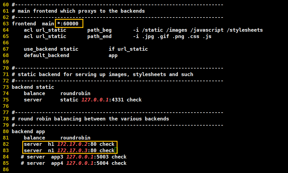 가상머신에 haproxy 설치 , 가상머신의 60000포트로 접속후 새로고침 했을때 h1,n1 번갈아 가며 나타나게 합니다.