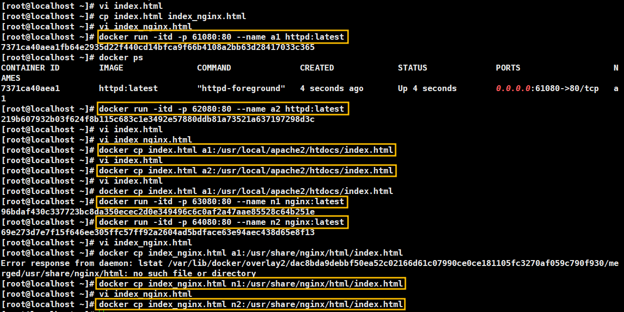 httpd:latest 이미지로 a1, a2 컨테이너를 만들어주고 index.html을 파일들을 컨테이너로 복사해줍니다.