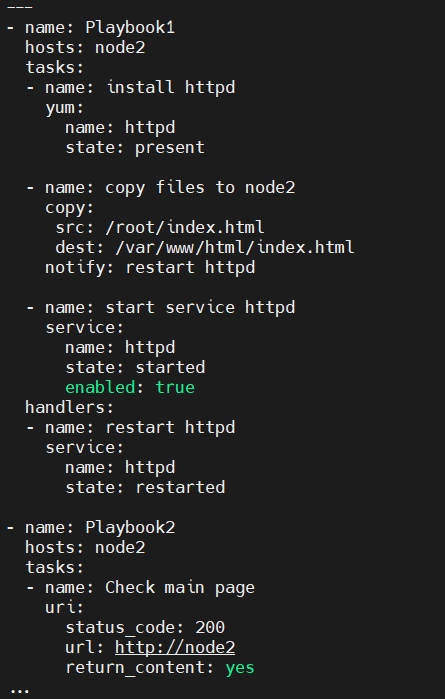 인벤토리 파일에서 정의한 대상들이 무엇을 수행할 것인지 정의하는 역할을하며, yaml 포맷으로 설정합니다. 앤서블을 사용하려면 이 playbook을 잘 다룰줄알아야하며, 단독으로 사용되는 것이 아닌 인벤터리와 플레이북의 조합으로 같이 사용합니다. 플레이북 yaml 파일의 예시는 아래와 같습니다.