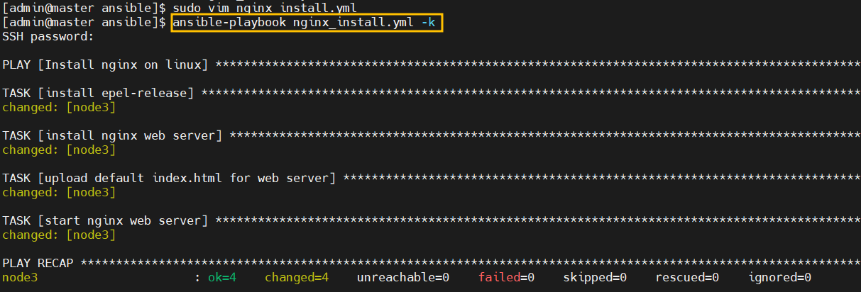 ansible-playbook 으로 yml 파일을 실행합니다. -k 옵션을 주어 암호를 입력받도록 했습니다